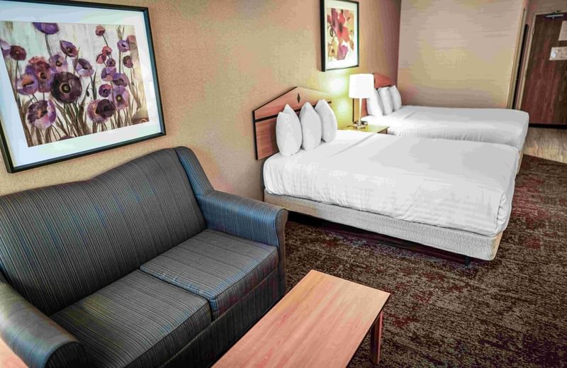 Hotel room with two beds, couch, and coffee table at Crystal Inn Murray Midvalley
